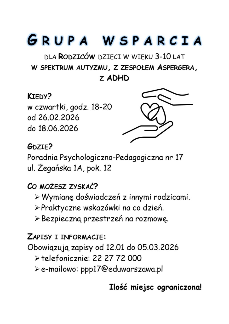 Grupa wsparcia jest skierowana do rodziców dzieci w wieku 3-10 lat, którzy szukają przestrzeni do swobodnych rozmów, chcą zdobyć praktyczne porady oraz poszerzyć swoją wiedzę na temat codziennego funkcjonowania dzieci z ASD, ADHD, w spektrum autyzmu, z zespołem Aspergera.