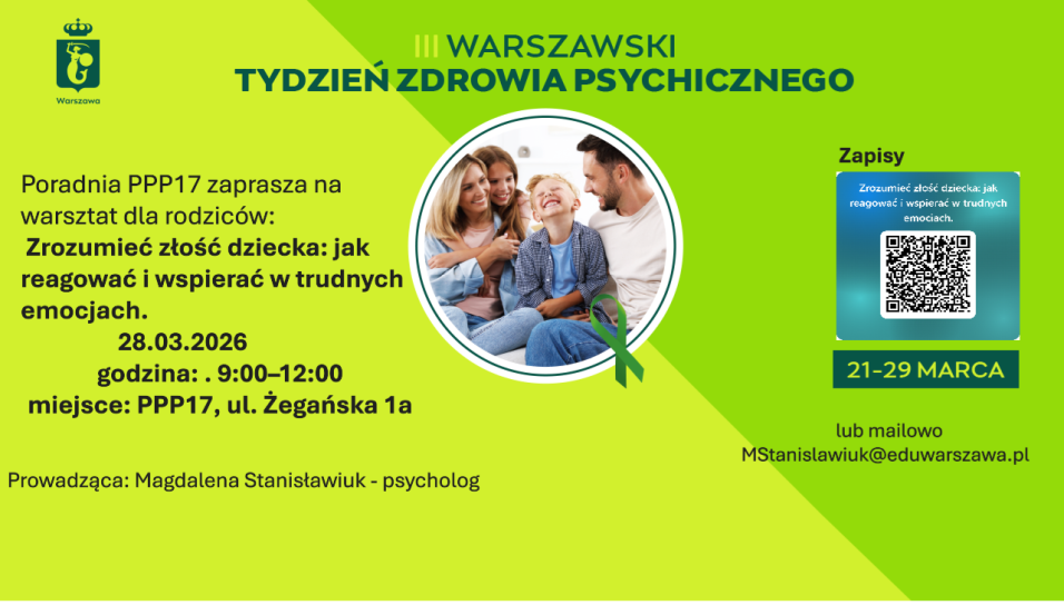 Poradnia Psychologiczno-Pedagogiczna nr 17 zaprasza na warsztat "Zrozumieć złość dziecka: jak reagować i wspierać w trudnych emocjach", organizowany w ramach Warszawskiego tygodnia zdrowia psychicznego.